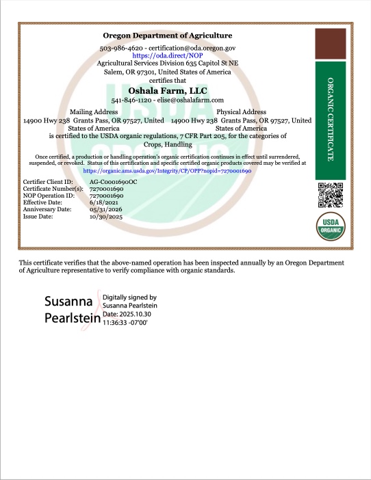 Click below to view or download our Oregon Dept. of Agriculture/USDA Organic certificate: