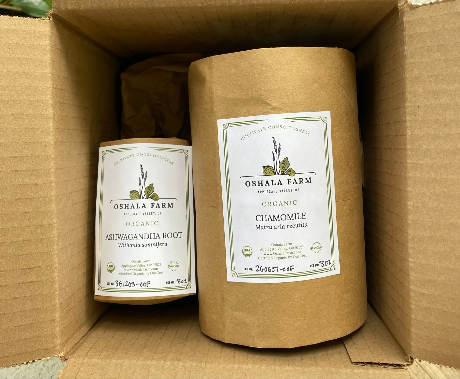 We are so excited to share with you a new endeavor to lessen our footprint at Oshala Farm. Join us in the trial phase of re-working our packaging to reduce single-use plastic. We believe sending our herbs in compostable packaging is even better for the health of our environment than recycling plastic bags. We are interested to hear your opinion as we trial a few sizes of paper bags that are food grade, organic compliant, post-consumer recycled paper, and are easily compostable. We choose these particular bags to trial verses the cello-lined bags because these bags use less resources and are more easily compostable.