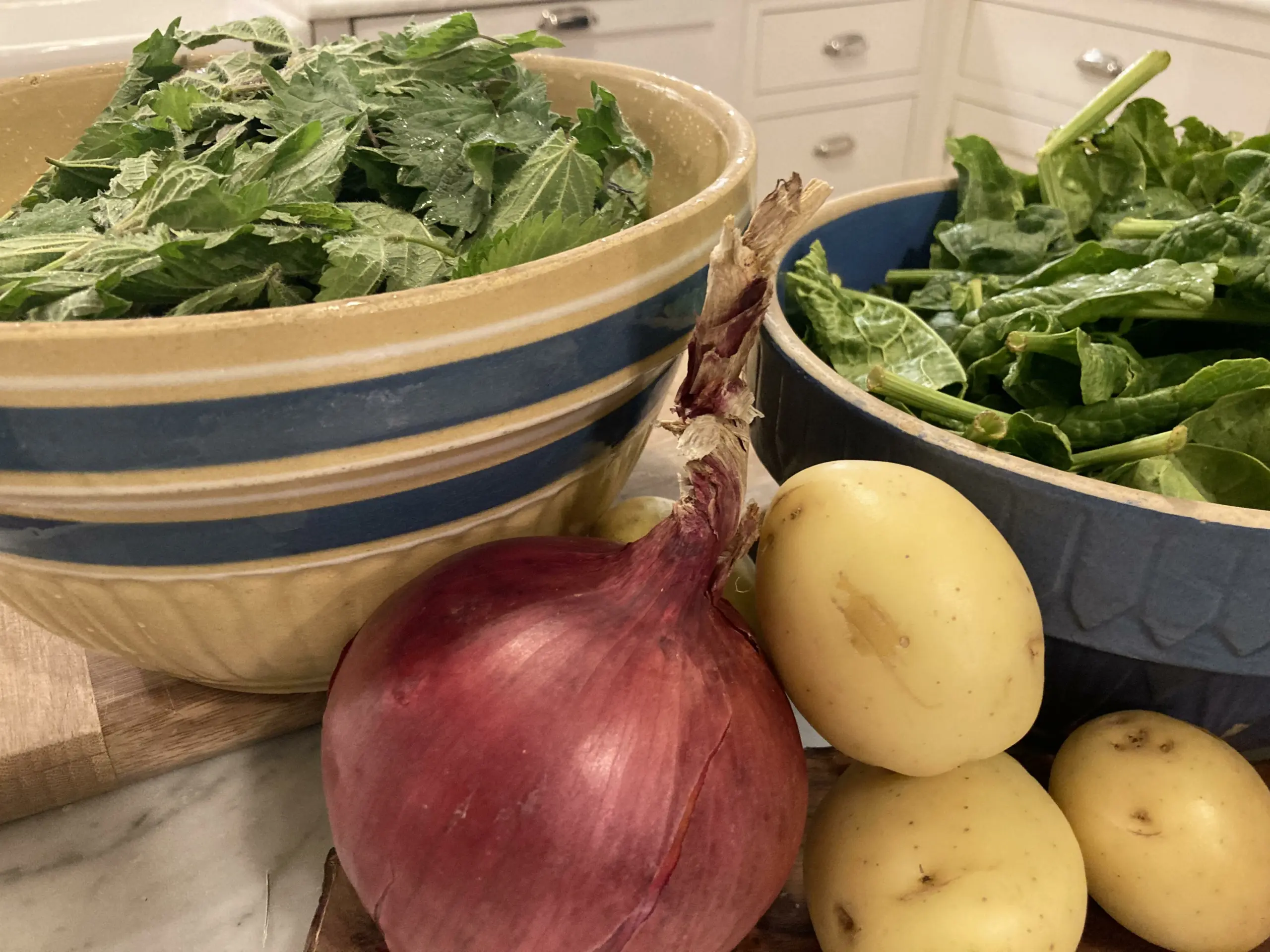 Toss the nettles and spring greens into the pot and sauté until the greens are wilted, then add broth and spices. Bring to a gentle simmer. Simmer for 10-15 minutes.