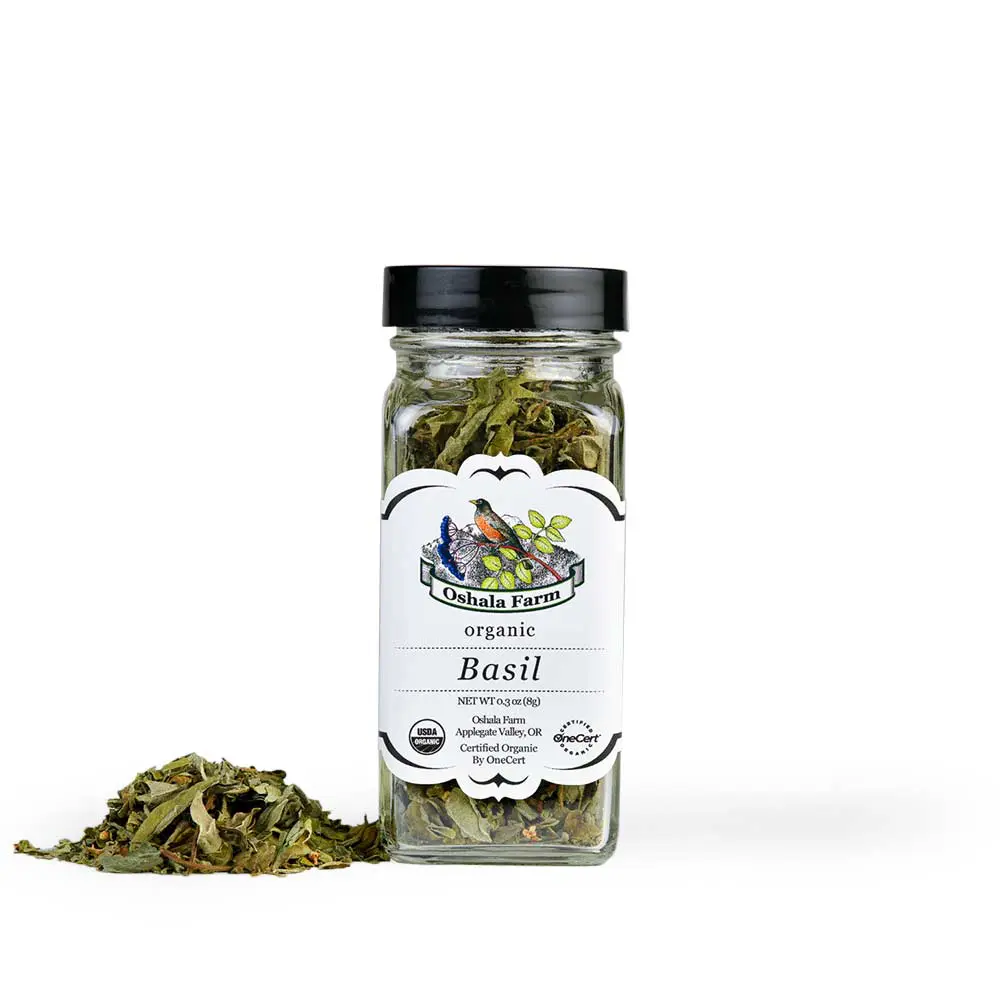 Organic Basil .75 ounces in a French Square glass bottle. All Oshala Farm Spices are crafted in harmony with nature in the Applegate Valley of Southern Oregon and nourished with pristine, water, air and soil. By choosing our products you are supporting an Earth-centric business that is striving to make a difference on our planet.