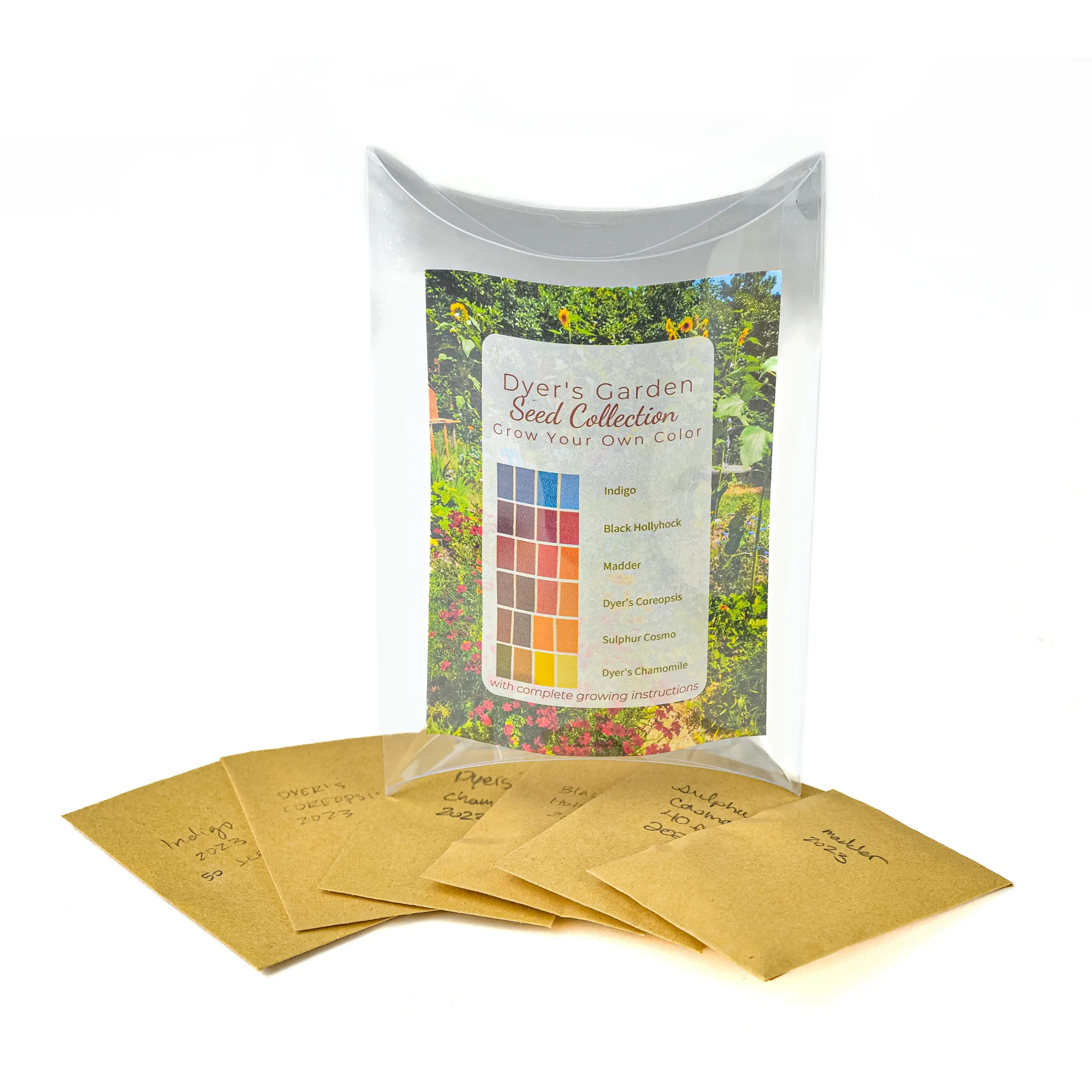 Dyer’s Garden Seed Collection includes Indigo, Black Hollyhock, Madder, Dyer’s Coreopsis, Sulphur Cosmo, and Dyer’s Chamomile.