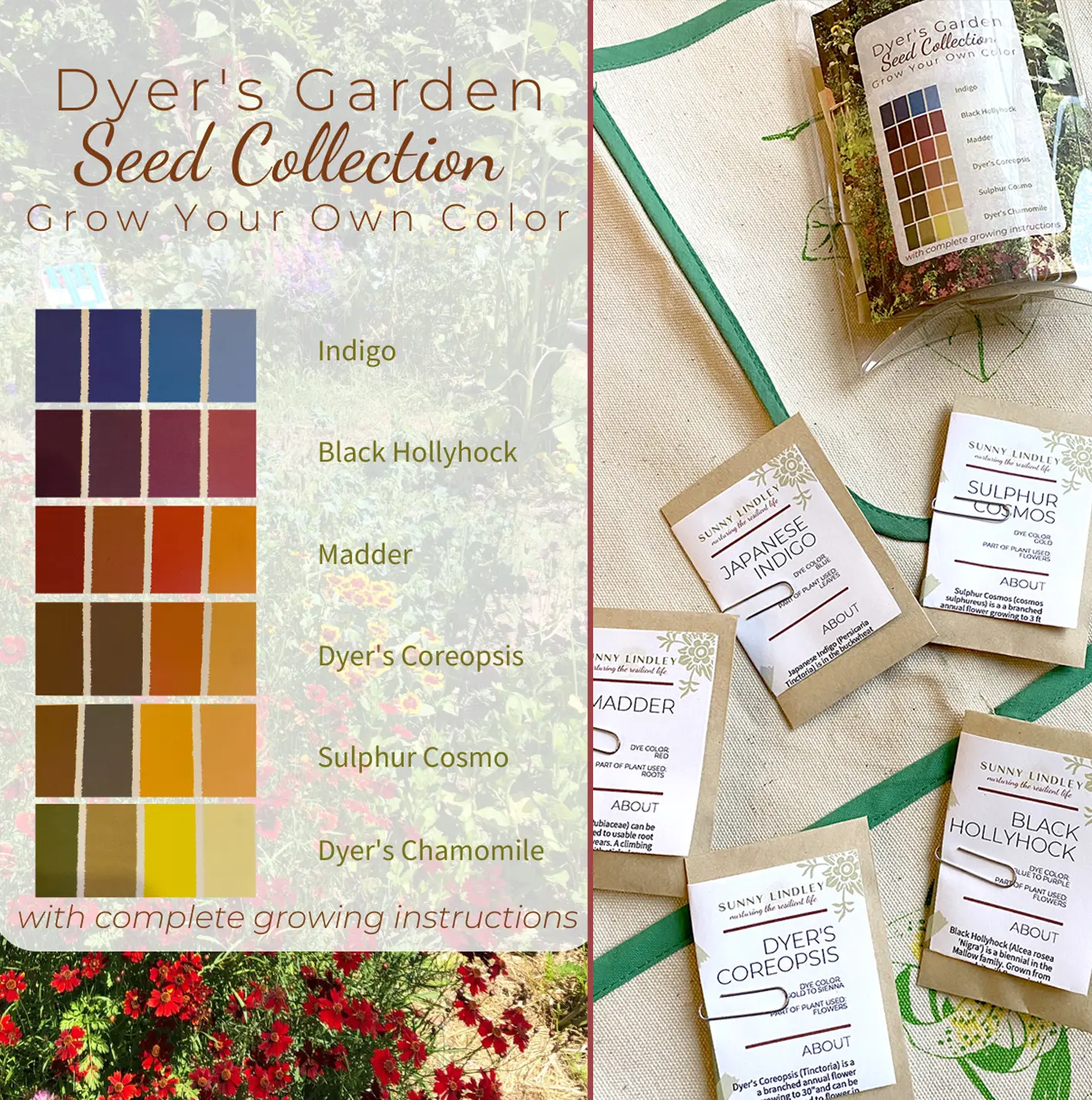 The collection includes: Indigo, Black Hollyhock, Madder, Dyer’s Coreopsis, Sulphur Cosmo, and Dyer’s Chamomile.