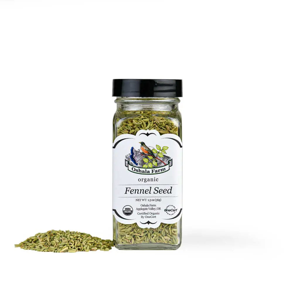 Organic Fennel Seed 2 ounces in a French Square glass bottle. All Oshala Farm Spices are crafted in harmony with nature in the Applegate Valley of Southern Oregon and nourished with pristine, water, air and soil. By choosing our products you are supporting an Earth-centric business that is striving to make a difference on our planet.