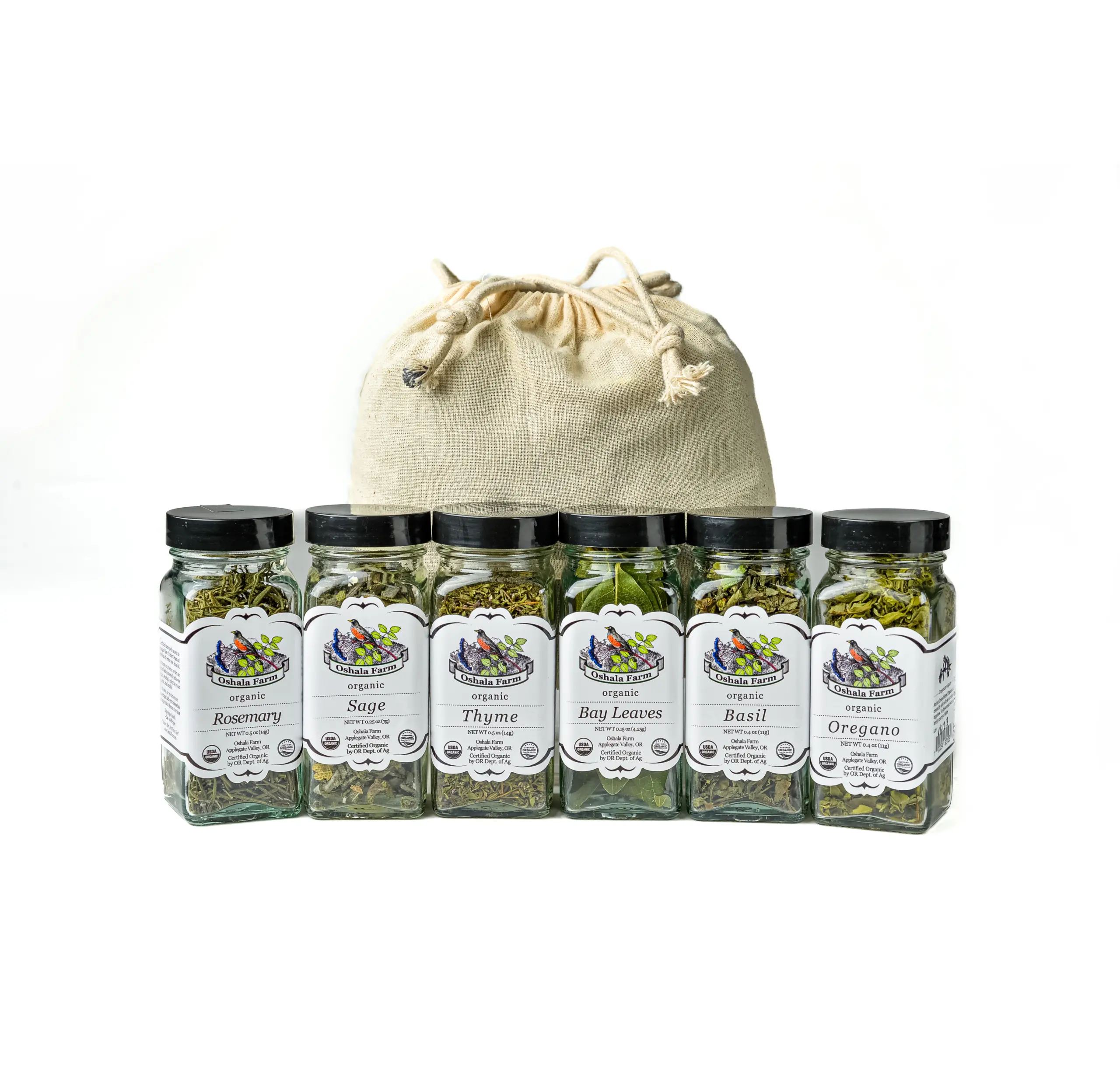 Organic Herbs in a French Square glass bottle. All Oshala Farm Spices are crafted in harmony with nature in the Applegate Valley of Southern Oregon and nourished with pristine, water, air and soil. By choosing our products you are supporting an Earth-centric business that is striving to make a difference on our planet.
